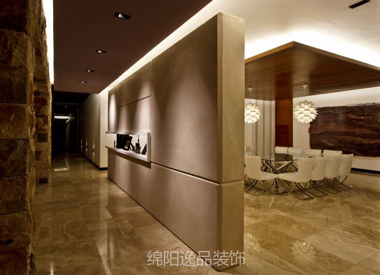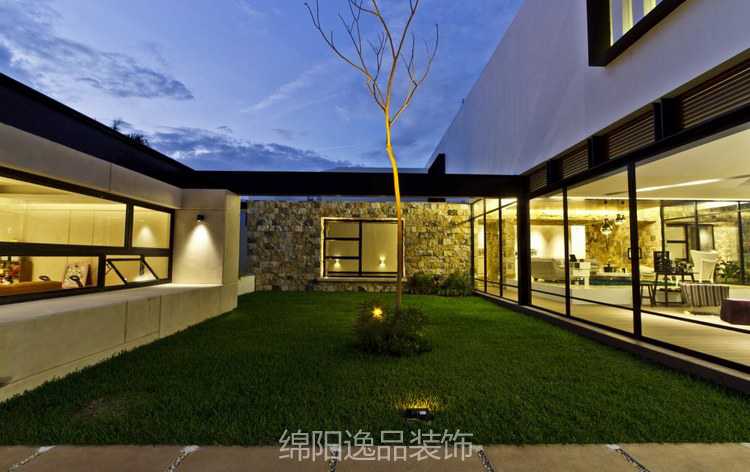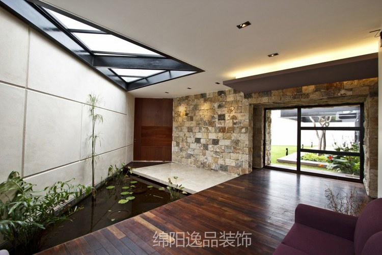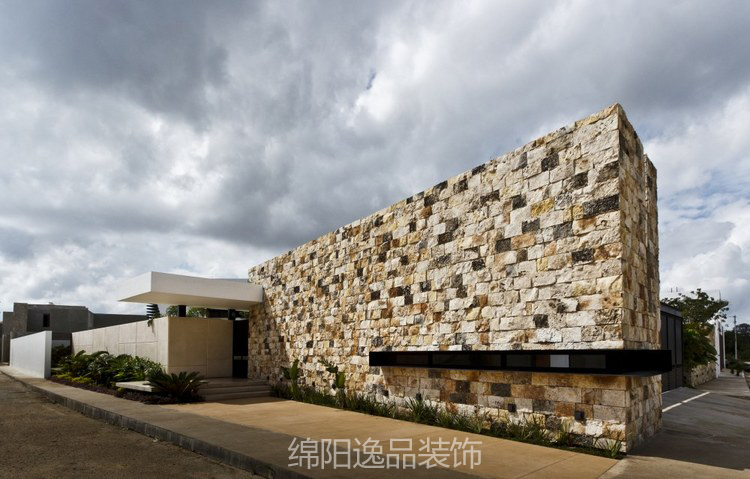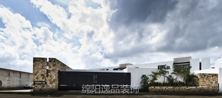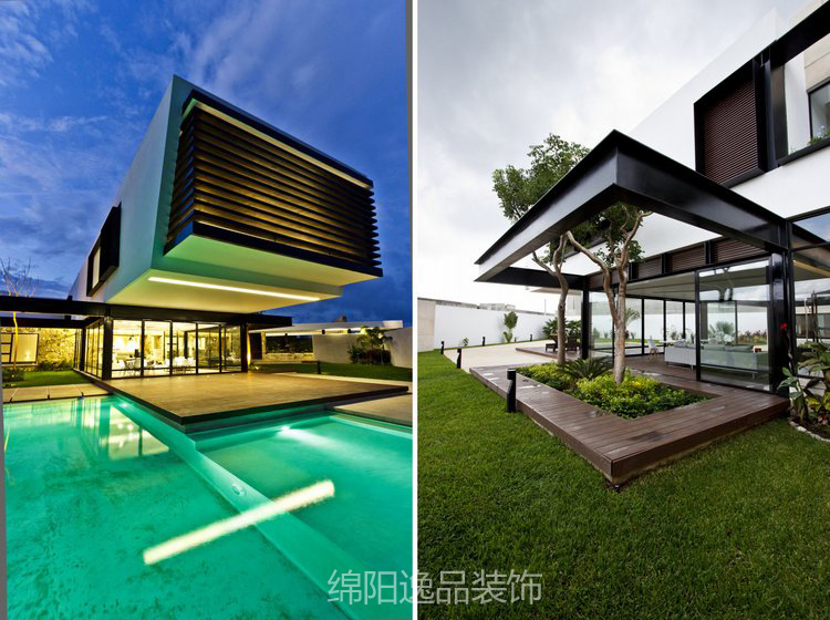 本案的住宅区内拐角处是一块不规则的四边形场地上。长边长60m,朝东;39m长的一边则朝北。设计师意在为住宅空间营造不受墙壁限制的家庭氛围,将室内外空间融为一体,突出不同空间的视野。为了实现这一目标,设计师将原本的一个走廊翻转45°,以调节风向和更好地发挥空调的=功效。这一改变也将花园融入住宅区。最后,为了强化设计概念,走廊被划分为两部分。第一部分位于悬浮于地面之上的坚实体量上,容纳着私人区域和社会区域,由不同楼层间的平台组成,定义了空间层次。