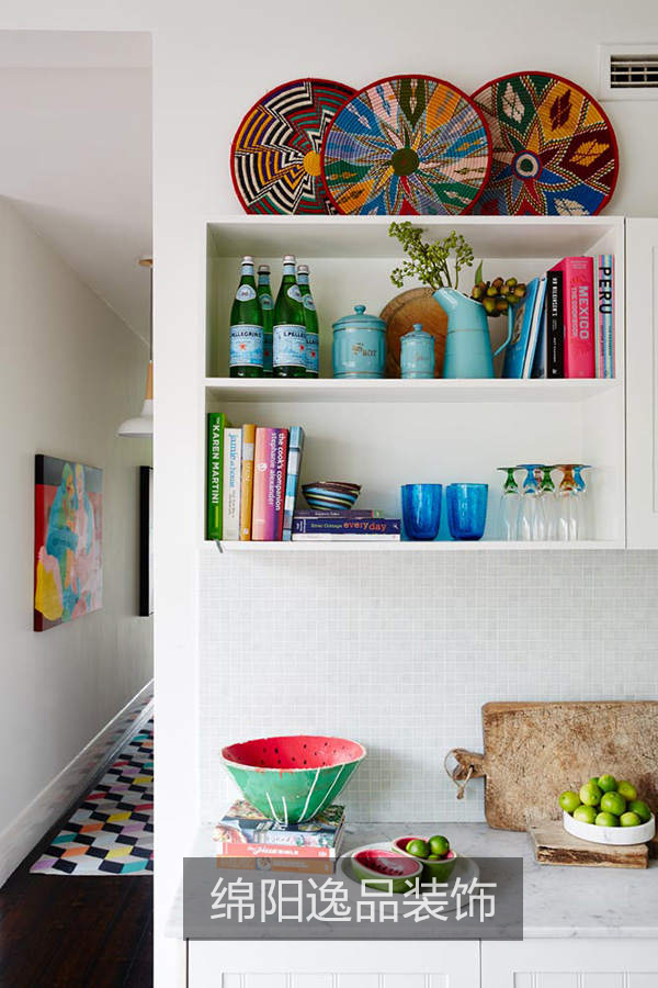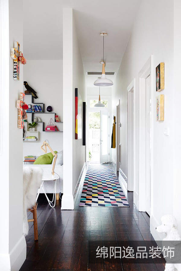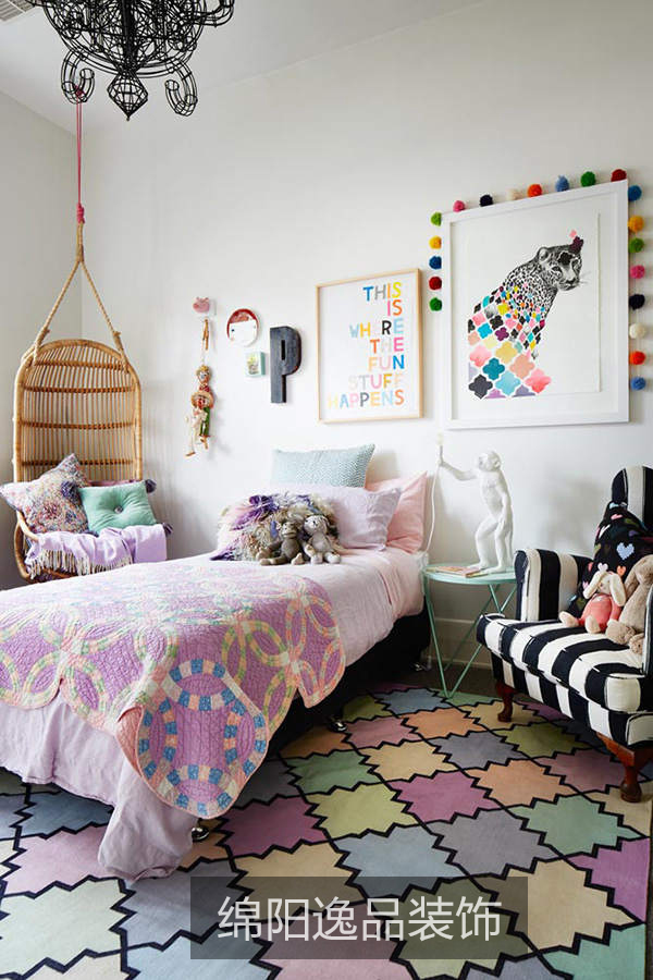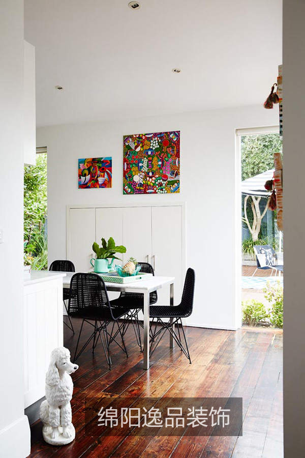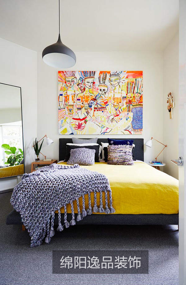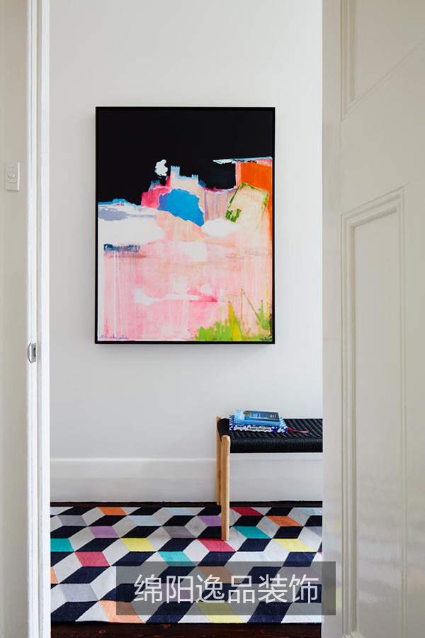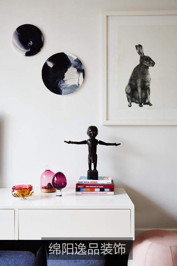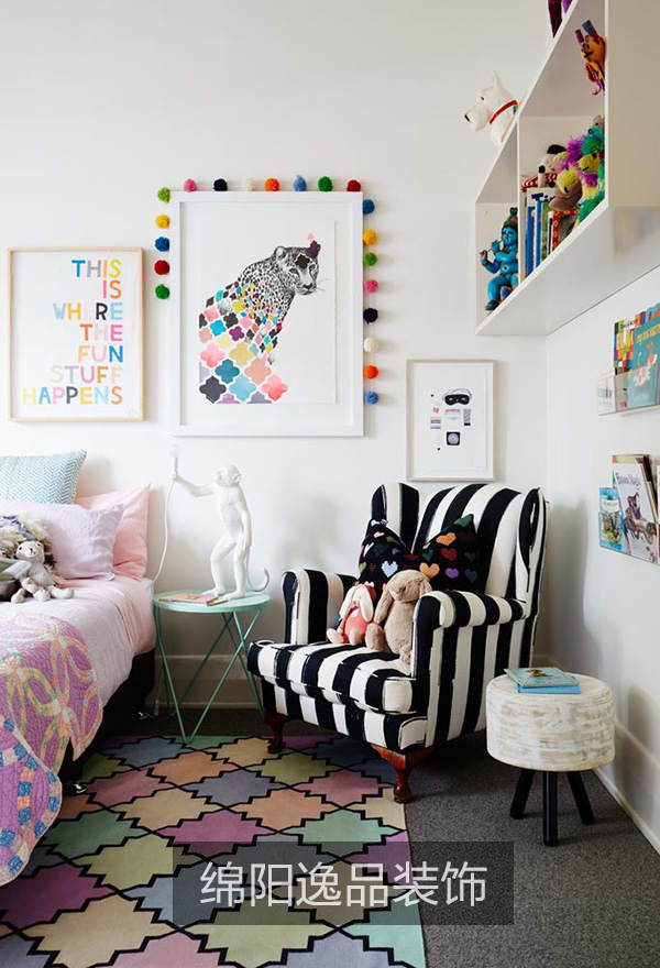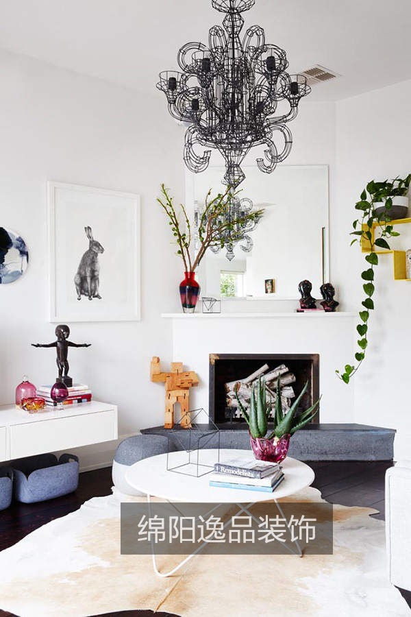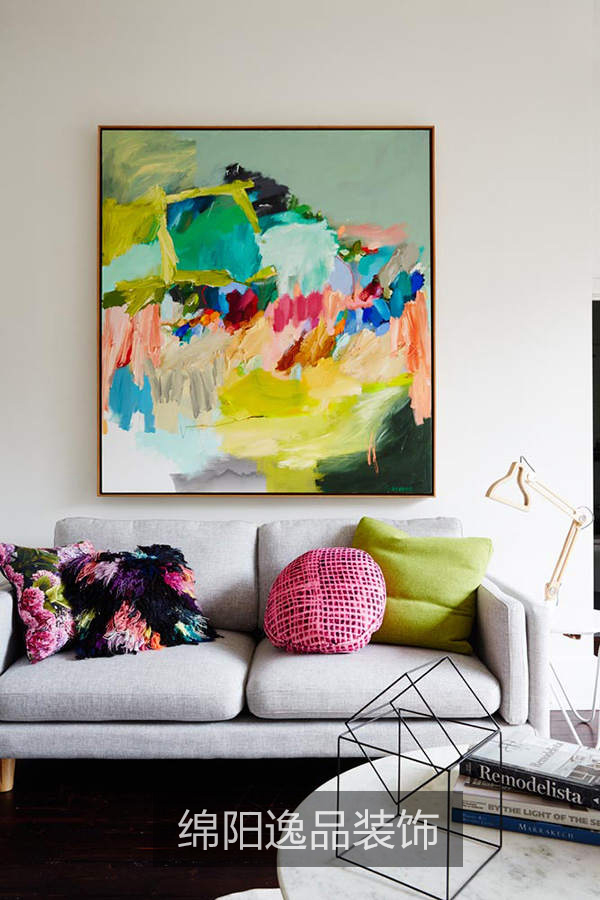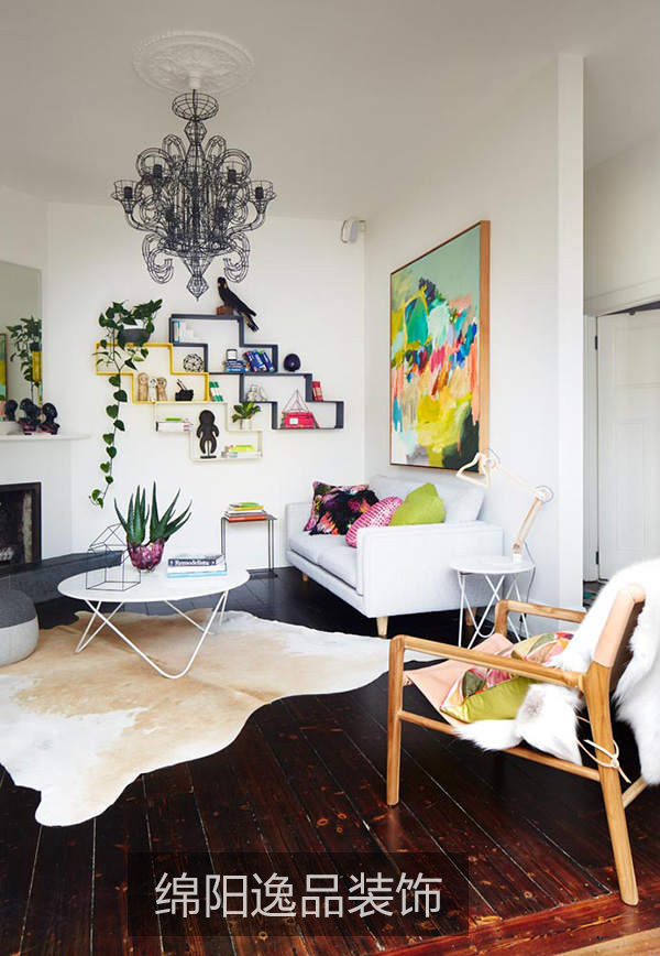 如何让空间拥有丰富色彩的生动有趣又能避免焦躁感?绵阳逸品装饰的设计师将家具的色彩简洁化,例如灰色的沙发,白色的置物柜,原木本色的单人椅,而配饰上则以大胆、艳丽为主,例如靠垫、装饰画,或是墙面上的艺术品,从而达到色彩繁与简之间的平衡,并以此带来空间独特的艺术气息