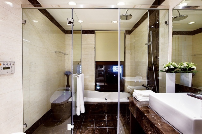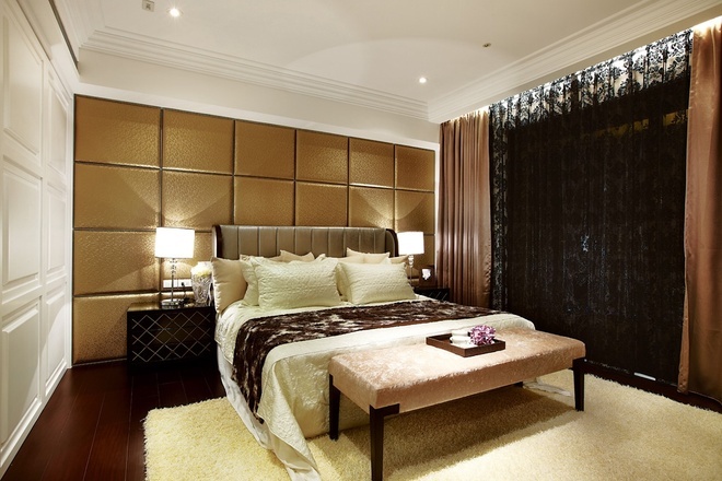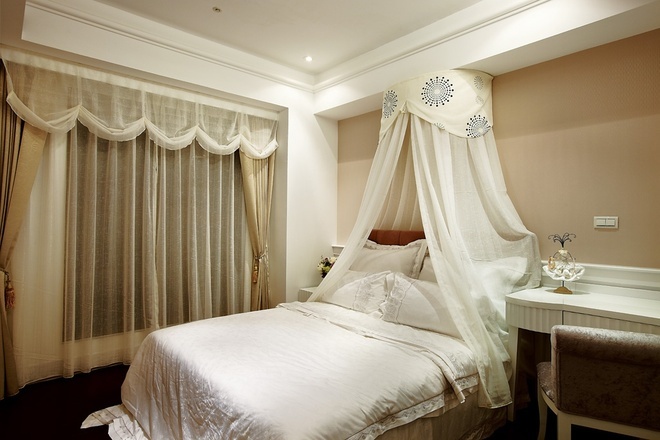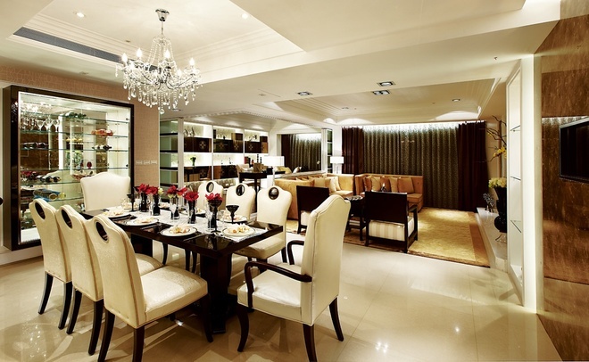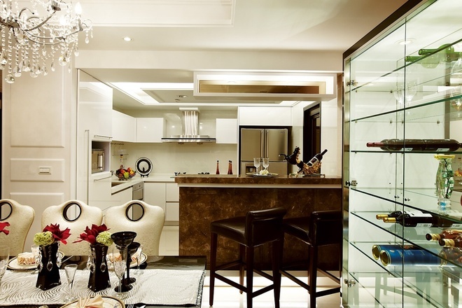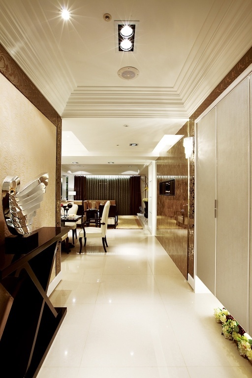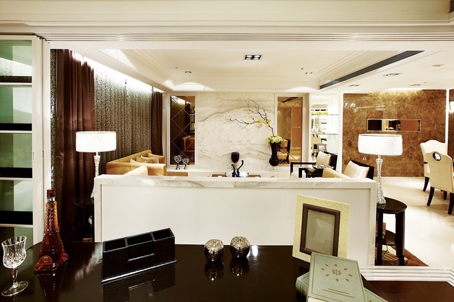 整个公共区域採以开放式格局,不仅藉由无隔间的客厅、餐厅,甚至直到厨房空间来创造大面宽视觉,同时利用灵活的玻璃拉门设计,将客厅后方的书房也纳入客厅范围,使得公共区域的景身顿时倍增,同时也巧妙地利用书房的两道隔间牆作为造型装饰设计。私密空间各具特色。主卧室延续了华丽的调性,白色壁板与具有光泽的绷布床背板,再搭趁贵气图腾的窗纱佈置,展现备受宠爱的空间气氛,而小巧精緻的更衣间连接着拥有11楼窗景的奢华浴室,更大幅提升空间享乐指数,展现了豪宅的精粹设计与价值。